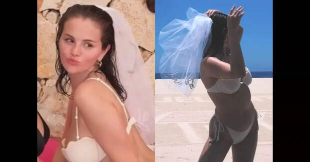 За время девичника Селена сменила несколько образов — от бикини с фатой и полупрозрачной туники до коктейльных платьев.