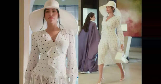 В видео модель в платье в горошек и шляпке наслаждается отдыхом в роскошном отеле, попутно притягивая взгляды других женщин.