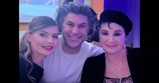 На снимке Цискаридзе сидит за столом и с одной стороны обнимает Ирину Винер, а с другой — Алину Кабаеву. Все трое улыбаются и смотрят в камеру.